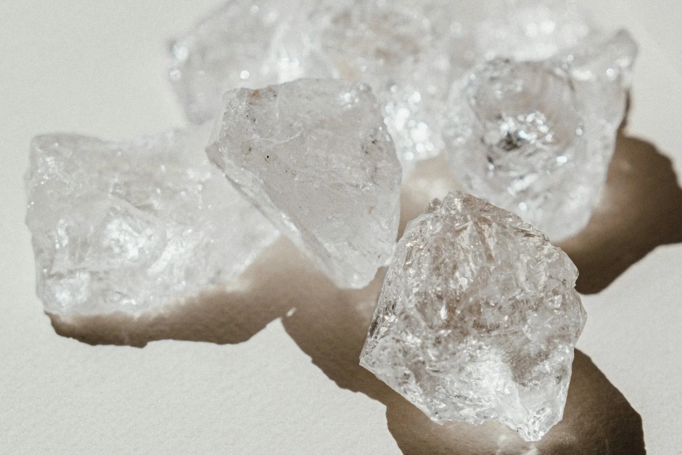 Quartz is a silicon dioxide (SiO₂) mineral known for its durability and stability. In its raw state, it varies in clarity, density, and internal structure.